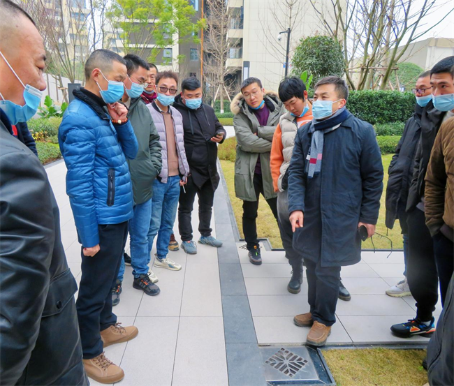 萬科·公園傳奇項目執(zhí)行經(jīng)理刁慶為大家詳細講解了施工過程中的技術重難點,逐一解答游學人員的問題,并重點講解道路鋪裝排版工藝:施工前應結合現(xiàn)場情況對圖紙和設計關系進行多次研究調(diào)整,基礎施工需借助全站儀/經(jīng)緯儀確保誤差在合理范圍內(nèi),鋪裝時應擅用控制線,時時檢查,及時糾偏修正,才能保證最終的呈現(xiàn)效果。