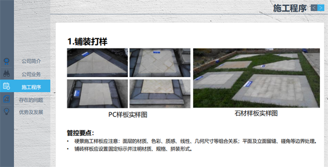 本次培訓(xùn)講師由工程部副總經(jīng)理廖述和擔(dān)任講師,培訓(xùn)上從公司概況、業(yè)務(wù)來(lái)源、工程施工程序、存在的問(wèn)題及應(yīng)對(duì)機(jī)制:通病預(yù)控措施講到公司優(yōu)勢(shì)、未來(lái)發(fā)展趨勢(shì)。其中施工程序廖述 和做了詳細(xì)講解,并針對(duì)鋪裝打樣、實(shí)測(cè)排版、鋪裝勾縫等規(guī)范施工工藝進(jìn)行圖文解說(shuō),過(guò)程淺顯易懂,讓新員工對(duì)公司業(yè)務(wù)流程有更深的認(rèn)識(shí)。