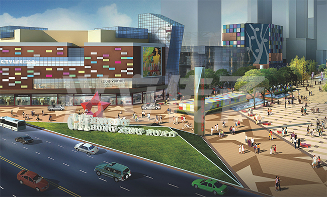 設計靈感來源于教堂頂部錯落的彩色玻璃,每一塊玻璃都用不同的色彩折射出設計者對城市的記憶。現(xiàn)代的、快速的、傳統(tǒng)的、彩色的、黑白的,各種矛盾的元素有機的融合在一起。以“蒙太奇”的手法,展示一個具有生命力的生態(tài)、時尚的商業(yè)街。